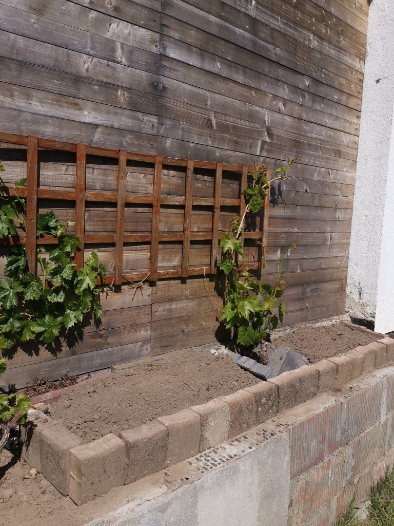 Es klingt nach einer komischen Mischung, auch wenn man ja am Tisch gerne mal papas Arrugadas und einen schönen dunkeln Rioja zu sich nimmt… An unserer Terrassenwand wächst eigentlich guter Moselwein… Allerdings nicht nur der. Denn Unkräuter sprießen in Hülle und Fülle! Probieren wir doch mal aus dazu nen Starknährer zuzufügen. Es ist alles einen Versuch wert! Nen langen Dänen (Asparges) gibt es dieses Jahr bei uns. Aber nicht nur im hochgesetzten Terrassen-Seitenbeet sondern auch in einer geteilten Tonne wird der Däne dieses Jahr kultiviert. Wo er bessere Qualitäten bildet und was aus dem Moselwein wird, das werden wir erst später in Erfahrung bringen…