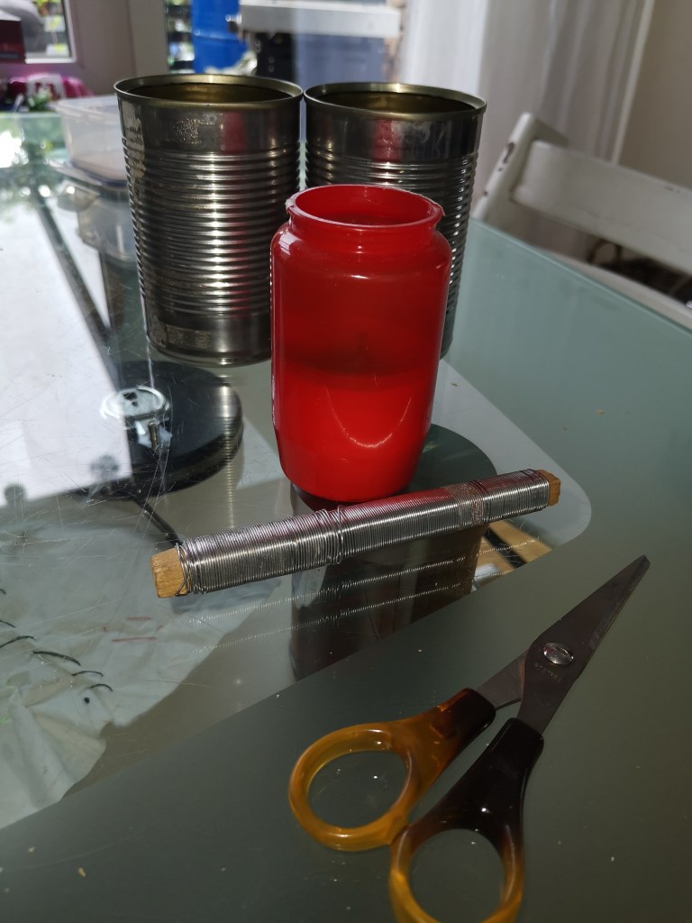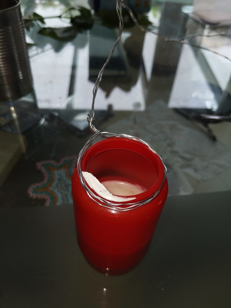 Eine Grabkerze, eine Schere und etwas Draht reicht schon aus. Die Kosten belaufen sich auf nicht mal 1 €.Etwas Draht um den Kerzenhals wickeln und einen Ständer formen.Eine alte Blechdose auf das Drahtgestrüpp hängen.